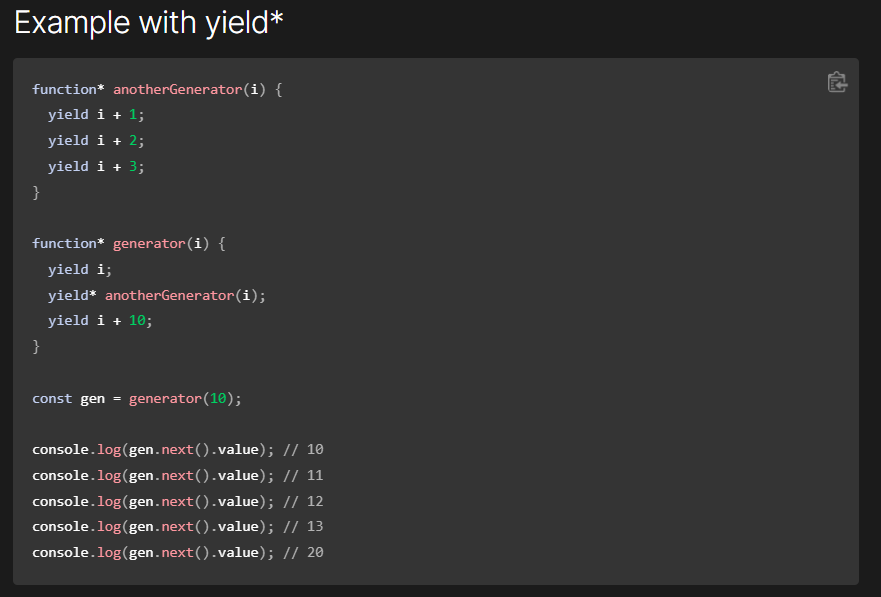 In a nutshell, an ES6 generator can be exited and re-entered at a later stage, with their context saved across instances. Using the next method will step through the function until it finds the next instance of the yield expression.